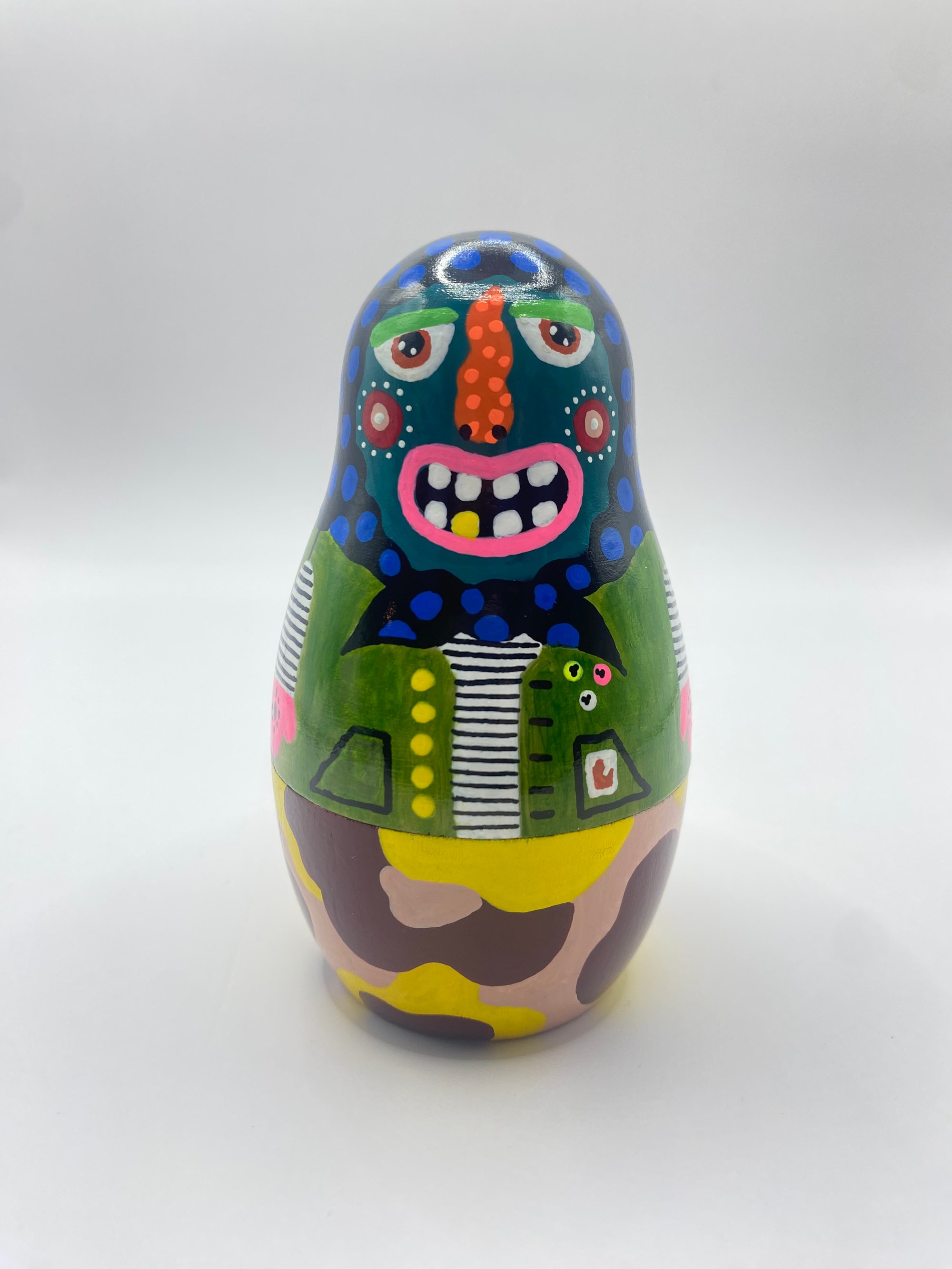 A set of 6 hand painted nesting dolls. Acrylic on wood with a gloss finish.
