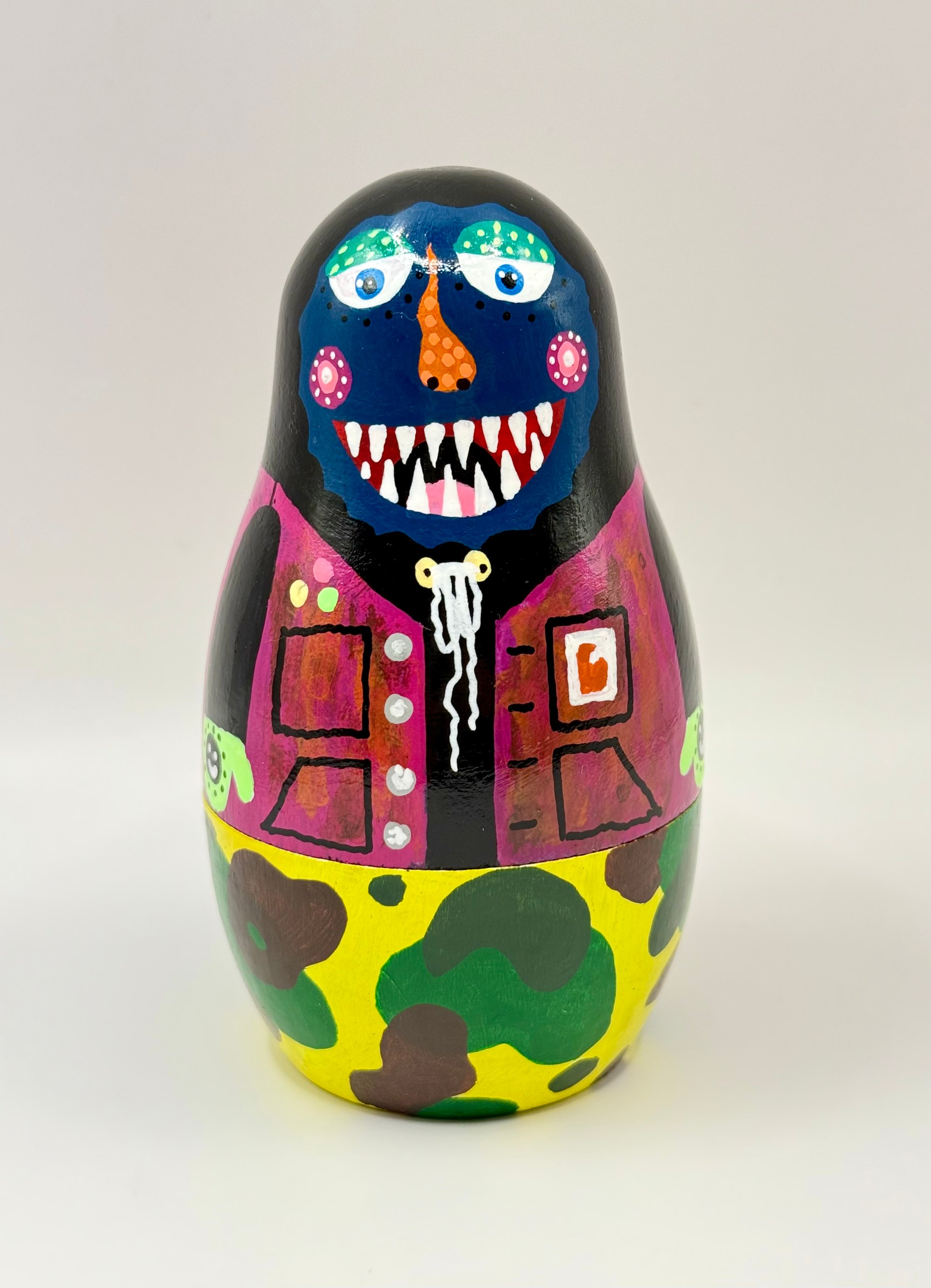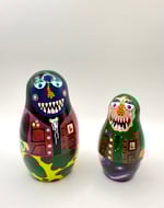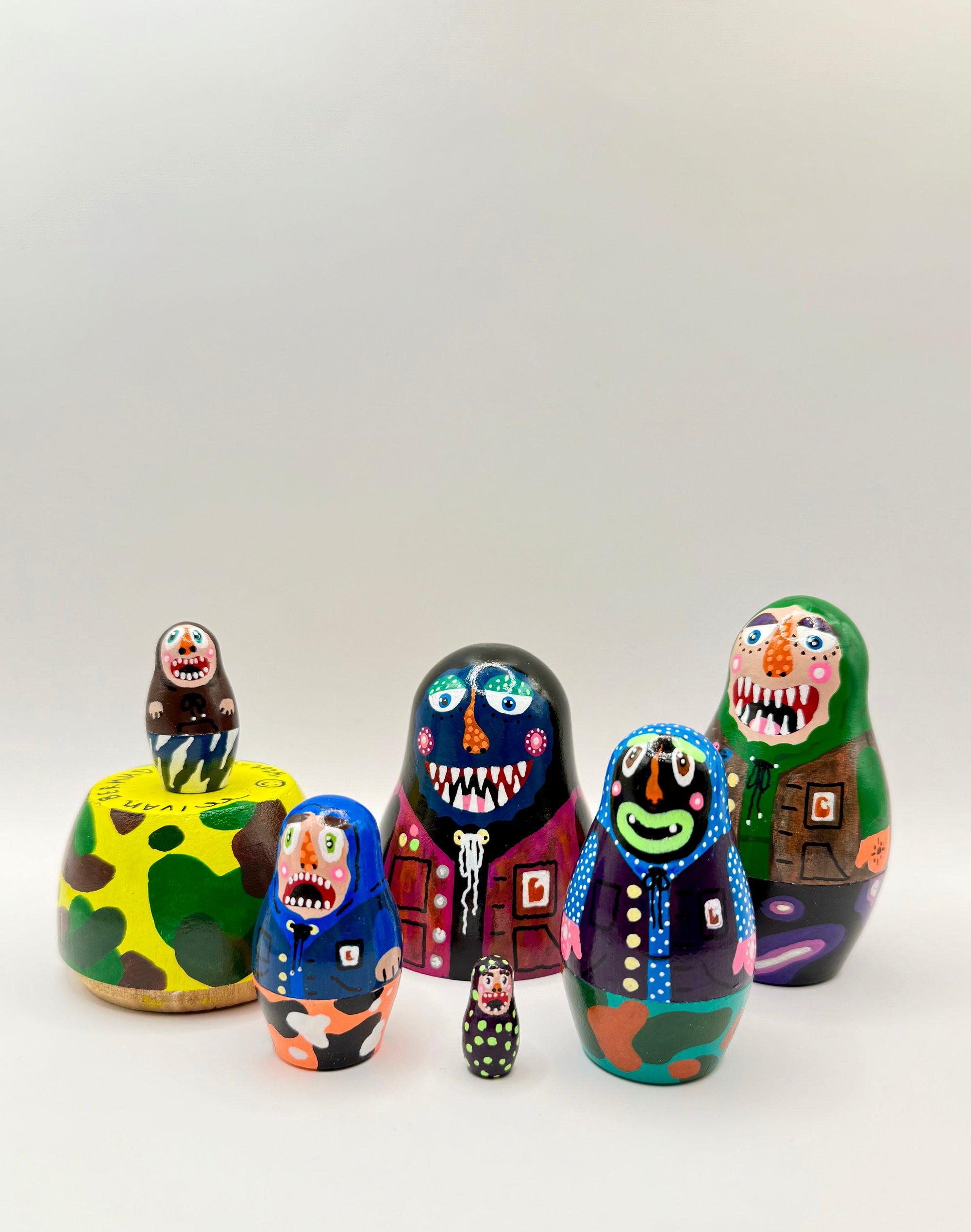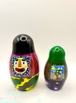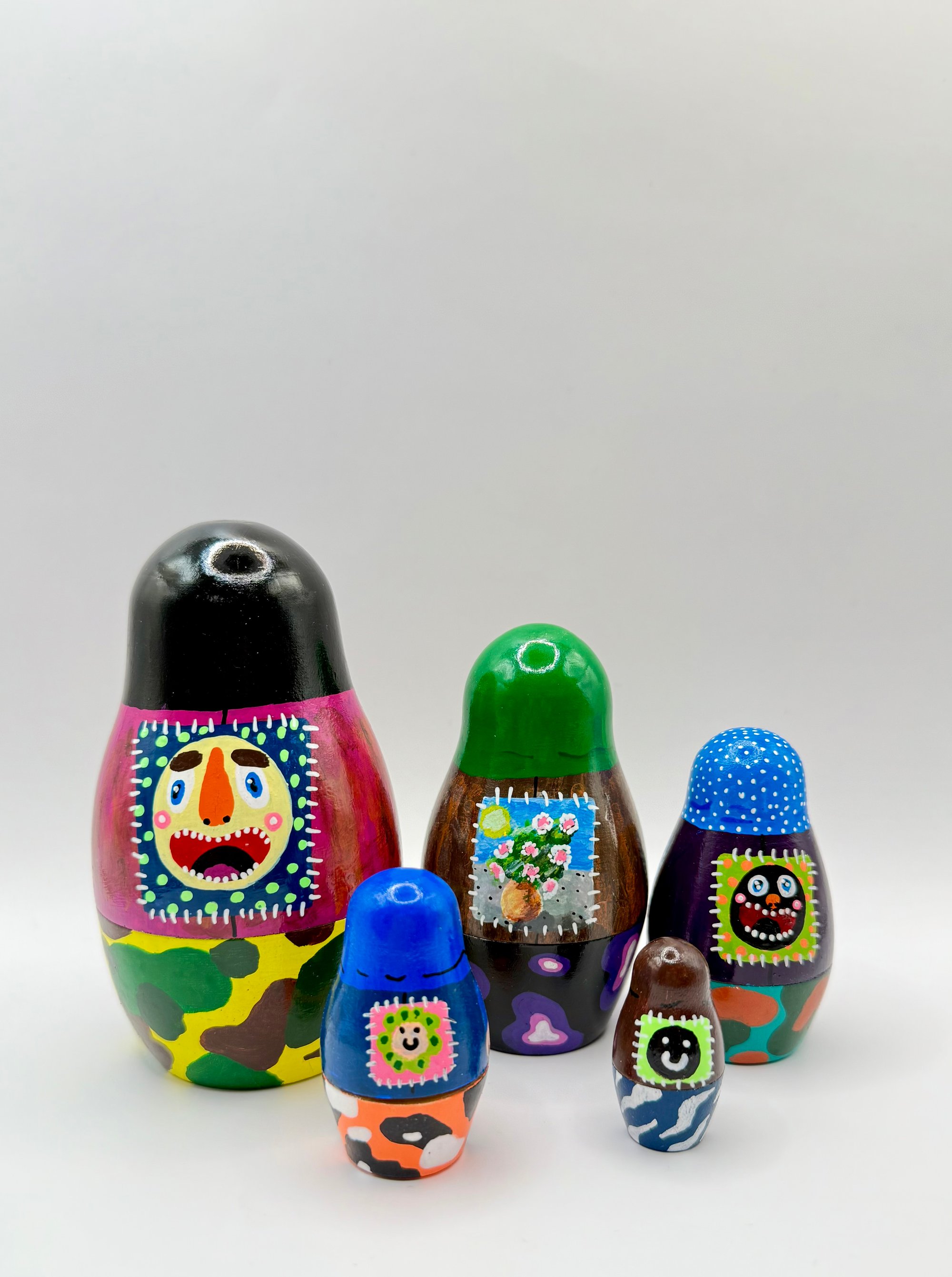 A set of 6 hand painted wooden nesting dolls. Acrylic on wood with a glossy finish .